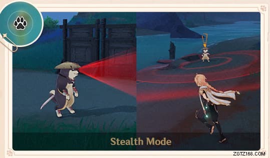 隠れスポットセグメントでは、プレイヤーは周囲の環境を利用して、刀を持った犬である犬分身を避ける必要があります。周囲に円形の検出ゾーンがあります。それを避けて、ユビキタスネットを使って行方不明の動物を救出してください。