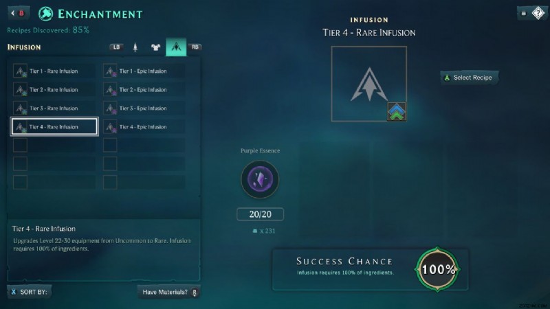輸液プロセスを開始するには 、ゲームのメイン メニューを開き、エンチャント オプションを選択します。新しいメニューで、R ボタンを 2 回押して Infusion メニューにアクセスします。ここでは、4 つの異なる層に分けられたさまざまなレシピを見つけることができます .最初のティアはレベル 1 ~ 9 の装備用、2 番目はレベル 10 ~ 15 用、3 番目はレベル 16 ~ 21 用、最後の 4 番目はレベル 22 ~ 30 用です。すべてのティアには、ギアをコモンからレア、レアからエピックに変えるための 2 つの異なるレシピが含まれています。