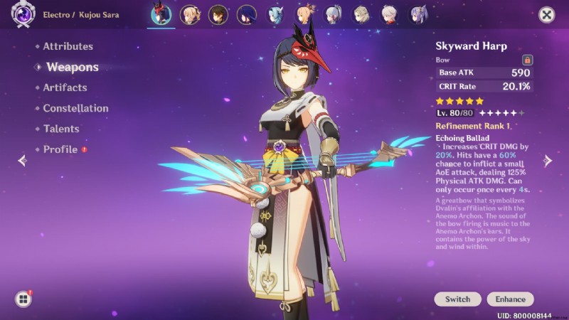 Genshin Impact Skyward Harp Bow:武器統計、入手方法、武器スキルなど