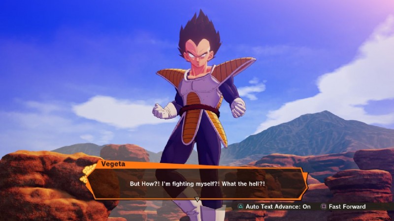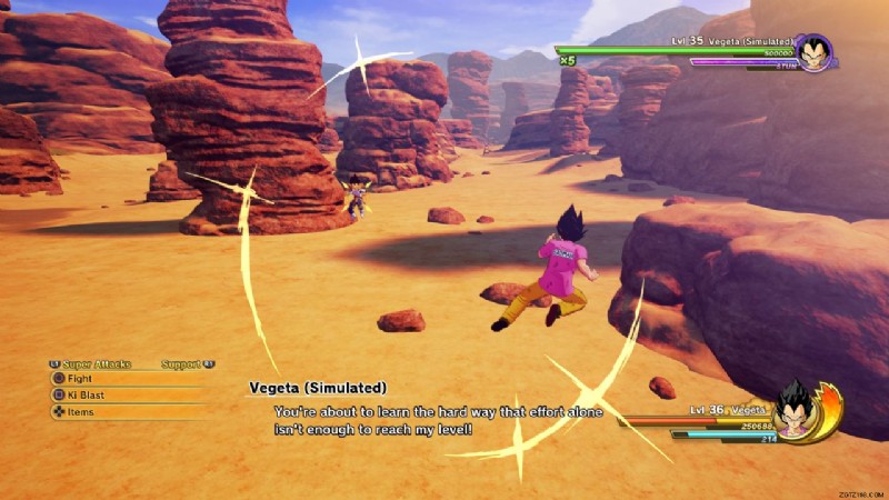 ベジータ (シミュレート)実際のベジータとほぼ同じように戦う 、そのため、特にキャラクターと戦闘システム全般に慣れている場合は、彼を倒すのに問題はないはずです.彼の短距離攻撃と遠距離攻撃はどちらもかわすのが簡単で、常に距離を保ち、気の攻撃を使用すれば、攻撃を受けることなく彼をとどめることさえできるかもしれません.