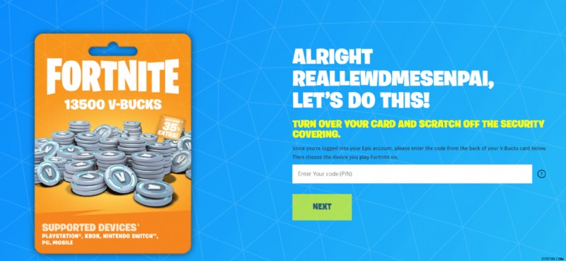 - V-Bucks カードからコードを取得し、所定のフィールドに PIN を入力します