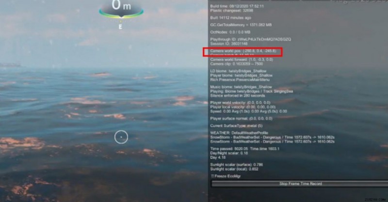 Subnautica:Below Zero で現在使用している座標を調べるのは非常に簡単です。まず、F1キーを押す必要があります。その後、右側にウィンドウが表示されます。そこで、「Camera world pos.」という行を探す必要があります。実際には、まさにこの行に座標があり、1 桁目と 3 桁目が水平で、2 桁目が海面からの垂直偏差です。正と負があり、正は水面より上、負は深さです。