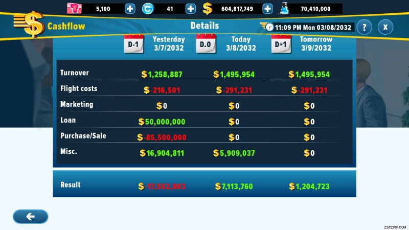 A wise investor will check their Cashflow often. Go to Administration, Finances, and then Cashflow. You’ll see a day-to-day summary of your income and expenses. You can use this data to compare how you’re doing with any new planes or flight routes. If you’re constantly losing money with each day, it may be time to rethink your setup. As a general strategy, it’s better to start small with the cheaper planes.