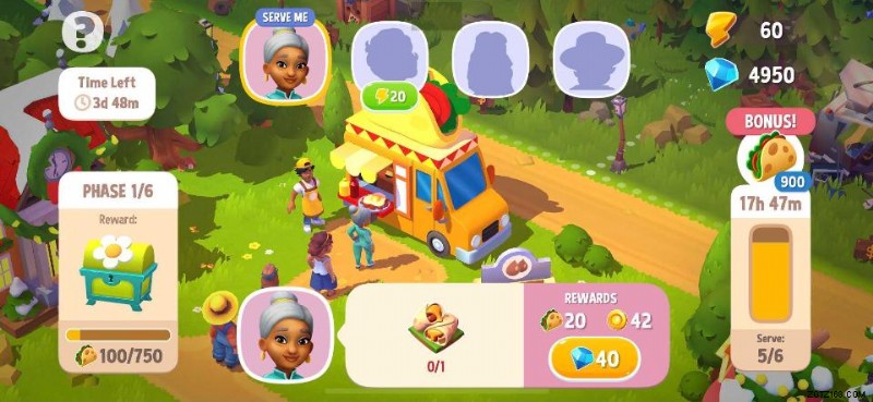 あなたの仕事は、フード トラックが農場にいる間に顧客にサービスを提供し、注文を完了することです。注文を完了する方法を知るには、それをタップします。 注文は一度に 1 つしか完了できません。新しい注文をプレビューするにはエネルギーを使用する必要がありますが、注文の作成はデザート スタンドとベーカリーで行われます。