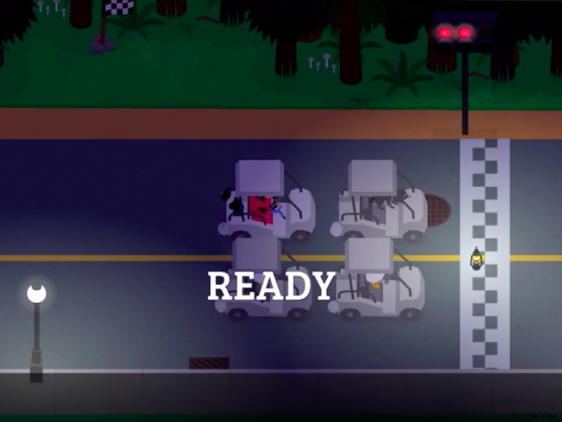 各アニマル レーサーがゴルフ カートに並び、レースの準備が整います。コツは、他の動物の後ろにとどまることです。前に進まないで、1位を取らないでください。左上隅で、レース中に自分がどの場所にいるかを確認できます。 1 位になった場合は、別の動物レーサーの後ろに戻ってください。