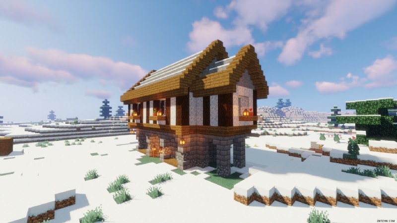 3 番目のクールな家は、冬とクリスマスの愛好家向けです。これは、主に板と丸太で建てられた小さいながらもかなり高い家ですが、石畳の土台があります。雪に覆われた生物群系にあるこのような家は、快適さと暖かさの雰囲気を作り出します.
