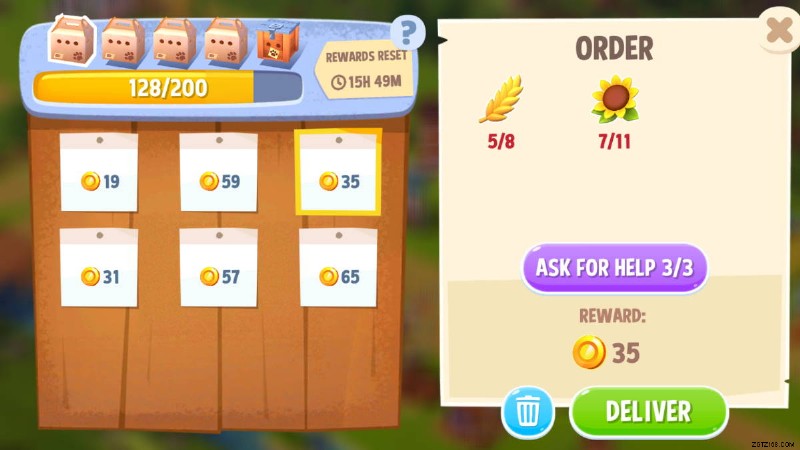 注文ボードには、一度に最大 9 つの注文があります。注文シートをタップすると、必要なものが表示されます。緑色のチェックマークが表示されている場合は、その注文に必要なアイテムがあります。配送ボタンをタップして注文を送信し、コインを受け取って報酬メーターを満たしてください。報酬メーターがいっぱいになると、無料の動物がもらえます!メーターはリセットされ、1 日に 5 回まで再び満タンにすることができます。最終ボックスで珍しい動物があなたを待っています。