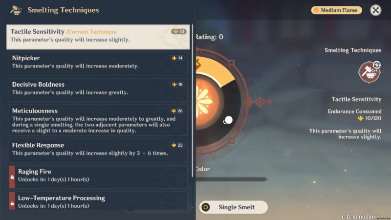 理想の製錬ゾーンは、製錬タブの左側から確認できます。製錬テクニックを使用すると、バーは一定の制限までいっぱいになります。 精錬技術のさまざまな組み合わせを使用して、完璧な品質を実現します。