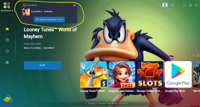 ステップ 3.) BlueStacks エミュレーターの左上隅にあるフィールドで FarmVille 3 を検索します