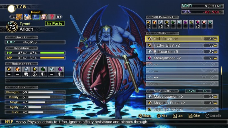 悪魔の潜在能力 、レジスタンスと同様に、特に変化はなく、アイス スキル (+5) の使用のみが得意です。 .彼のフィジカル+2 病気で +2 歓迎されますが、特にゲームを変えるものではありません。さらに、彼の電気で-7をキープしてください 電気スキルのためにスキル スロットを無駄にしないように融合する際に念頭に置いてください。