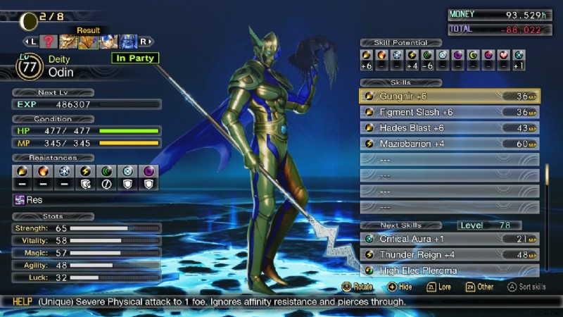 オーディンは、大量のダメージを与えるさまざまな物理的および電気的スキルを学ぶため、真・女神転生 V で入手できる最高の悪魔の 1 つです。彼の抵抗 ただし、北欧の神は電気を撃退することしかできないため、他の高レベルの悪魔と比較して、それほど優れているわけではありません。 そしてヌルライトとダーク .彼はフォースにも弱い ので、斬族のスキルを使用する敵と戦うときは注意してください。