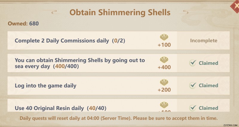 注: を収集する必要があります。 イベントページから手動でシマリングシェル。そうしないと、クエストがリセットされ、獲得したきらめく貝殻が失われます。ですから、忘れずに集めてください!
