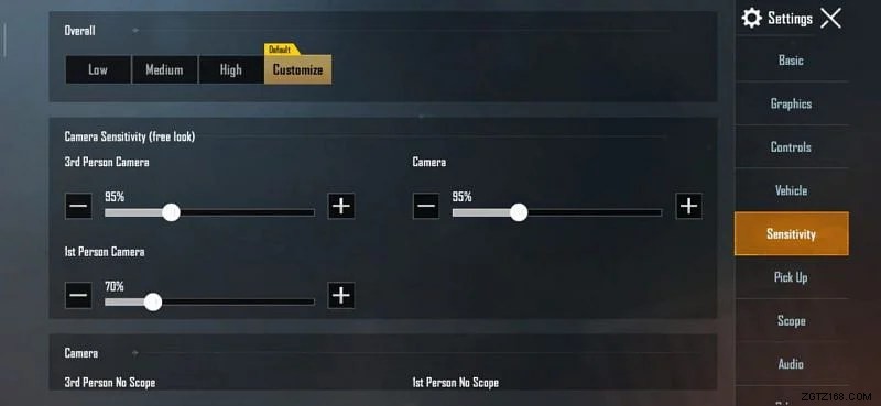 カメラの感度は、ゲーム内キャラクターのフリー ルック ビューに関連付けられています。画面上のスライダー バーを調整して、次の設定を行います。