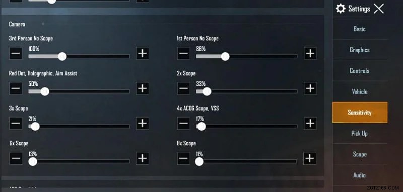 以下の設定は、M416、Scar-L、AKM などのアサルトライフル武器でのみうまく機能することに注意してください。 [設定] に移動し、[感度] タブに移動して、PUBG Mobile の感度設定を微調整します。