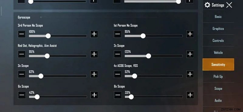 ジャイロスコープ センサーは、モバイル デバイスでスマートフォンの物理的な動きを追跡するために使用されます。ジャイロスコープの最適な感度設定は次のとおりです: