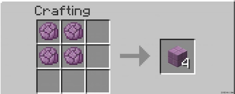 コーラスプラントを壊すとコーラスフルーツになります。次に、コーラスフルーツをかまどで調理し、ポップされたコーラスフルーツにする必要があります。ポップされたコーラス フルーツを 4 つクラフト グリッドに配置することで、4 つのプルプル ブロックを作成できます。