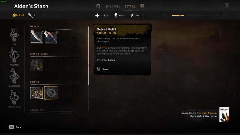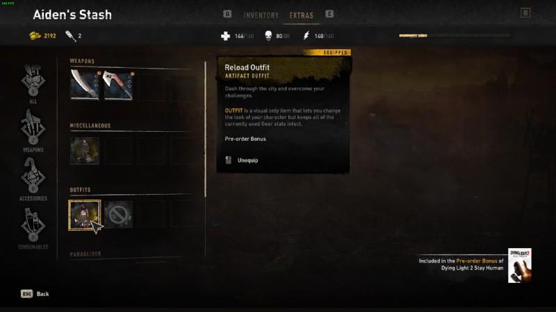Reload Outfit、Reload Machete、その他のアイテムなどの予約注文ボーナスを使用できます。なぜなら、Aiden の隠し場所の Extras タブで予約注文ボーナスを操作するだけだからです。