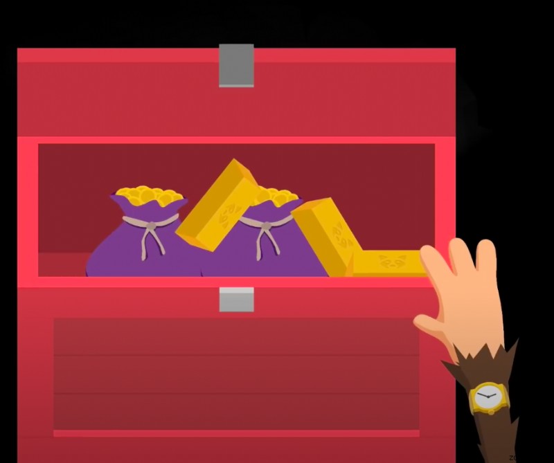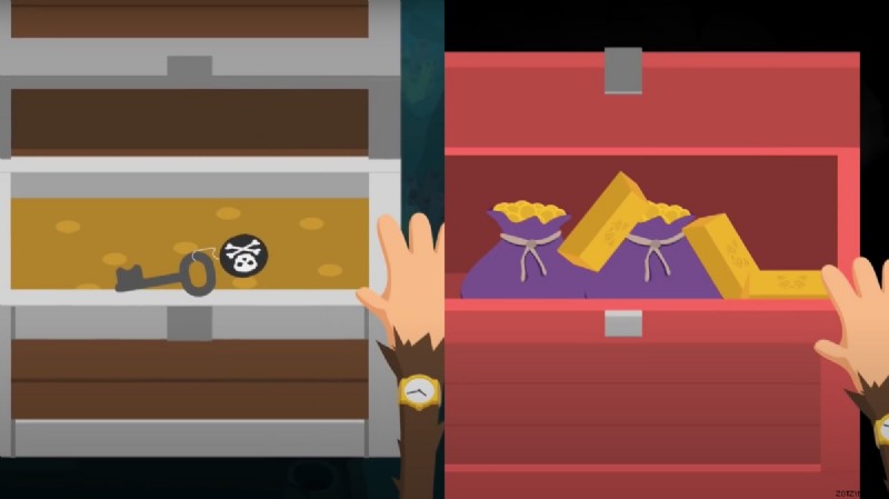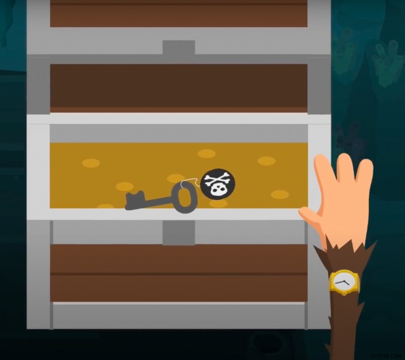 中に入ると、別のどくろが描かれた小さなドアが見えます。中に入って、赤いキャッシュ ボックスを見つけてください。キーでロックを解除し、ゴールドとコインをスタッシュに追加できます!