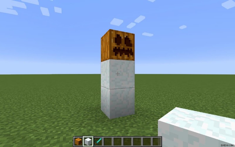 2 つの雪ブロックを作るには、合計 8 個の雪玉が必要です。上の画像のように、雪のブロックを 2 つ重ねて、その上に彫刻を施したカボチャまたはジャック オ ランタンを置きます。