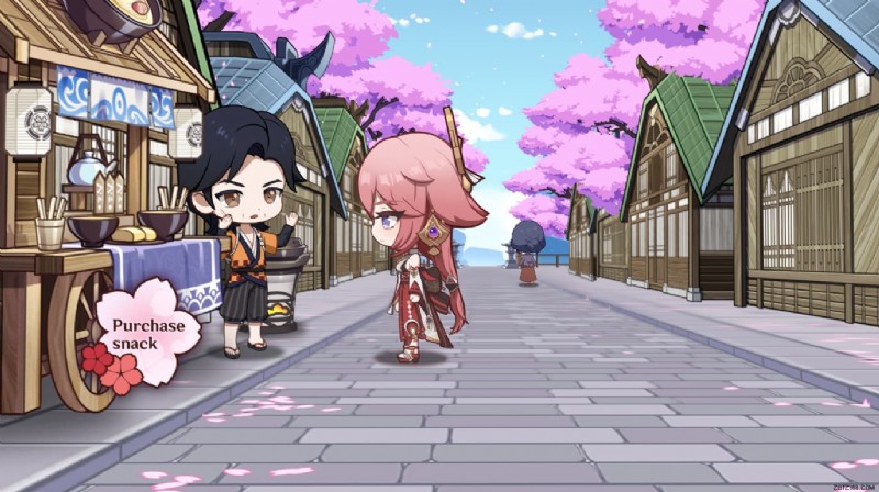 Genshin Impact の Kitsune ののんびり花見坂の Web イベントを開始すると、Yae Miko は屋台、Dango Milk ベンダー、Traveler、および浴衣屋の店主のように見える NPC に出くわします。