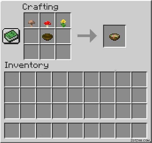 これらの材料が揃ったら、Minecraft で作業台を開きます。次に、上の列の左隅にきのこ(赤に白い斑点)を1つ、真ん中にきのこ(茶色)を1つ、上の列の右隅に花を1つ配置します。最後に、作業台の中央にボウルを置きます。次のようになります: