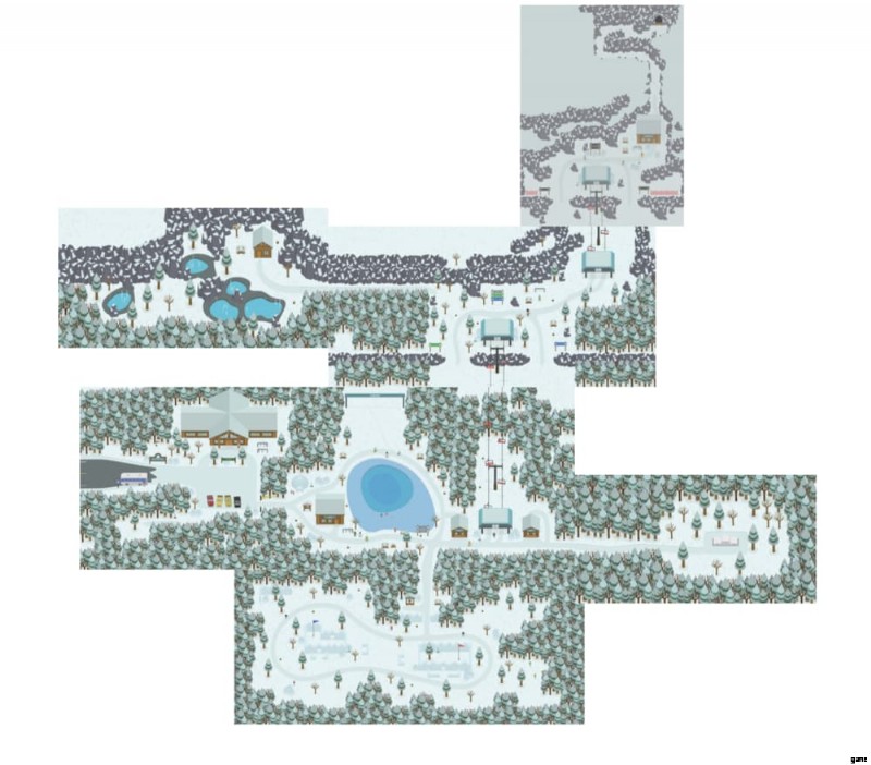 ゲーム マップの北東側にスキー マウンテンがあります。山の入り口には大きなロッジがあり、コインでチェックイン・宿泊ができます。