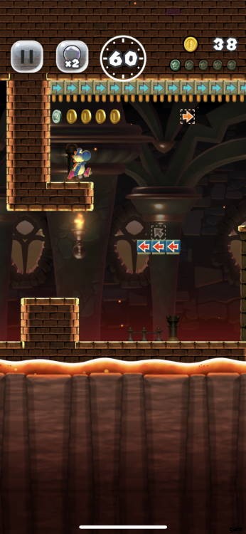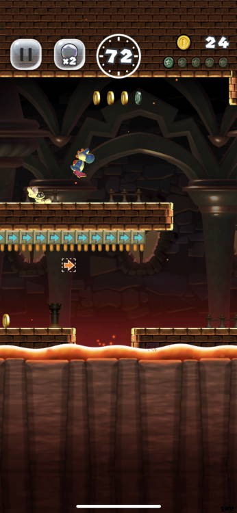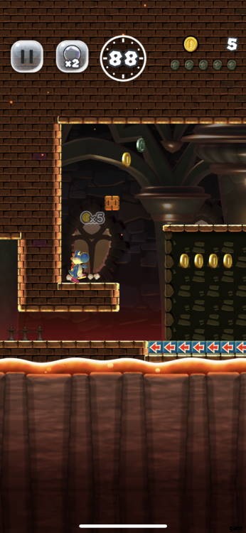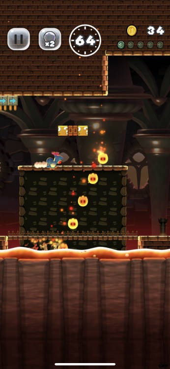 溶岩から一列に飛び出すポドブーの群れに注意してください。これは、3 枚目のコインに近づいていることを意味します。通常のレンガ ブロックを挟んでいる 2 つのクエスチョン マーク ブロックを探してください。3 つ目のコインは中に隠されています!