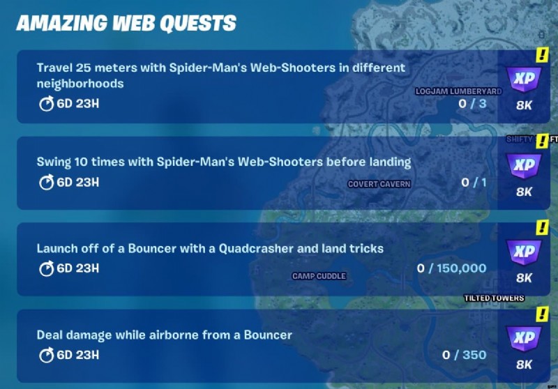 フォートナイト チャプター 3 シーズン 1 アメージング ウェブ ウィークのすべてのクエストの完全なリストは次のとおりです: