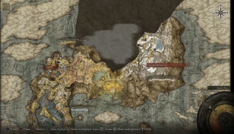 Rivers of Blood katana はChurch of Reposeの近くにあります。 巨人の山頂にあります。山頂にたどり着くには、まずレインデルの王都に行き、予言の王モルゴットを倒してから、ロルドのグランドリフトを使用する必要があります。ここから、下の地図で強調表示されている場所に到達するまで、エリアをナビゲートする必要があります.