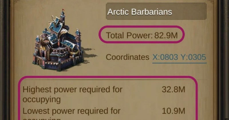 時折、北極バーバリアンとの特別なイベントがゲームに登場します。このイベント中、プレイヤーは世界地図上でさまざまな蛮族の城を見つけることができます。プレイヤーはこれらの城を攻撃できます。戦闘は通常の PvP と似ていますが、野蛮人は自分自身を守るだけです。あなたの攻撃が失敗した場合、彼らは城を再建します.