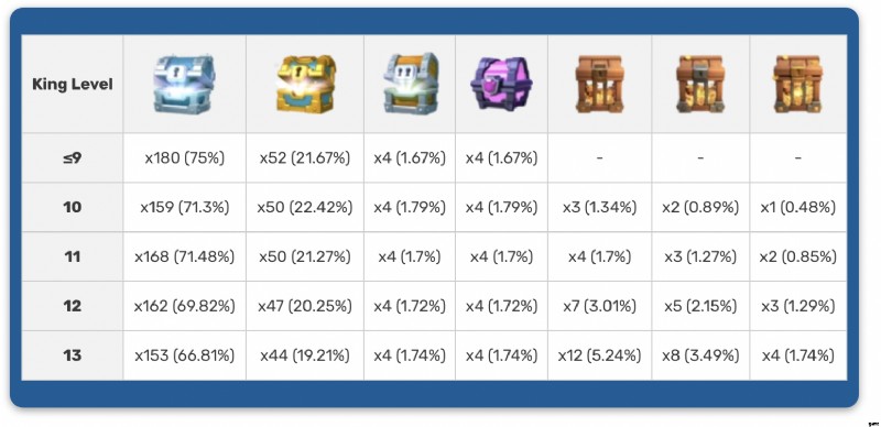 キング レベルのチェストもあり、キング レベルが上がると獲得できます。キング レベル 11 に到達すると、少量のシルバーおよびゴールデン チェストがゴールド クレート、プレンティフル ゴールド クレート、オーバーフロー ゴールド クレートに置き換えられ、一部のシルバー/ゴールデン チェストが完全に取り除かれ、サイクルが短くなります。