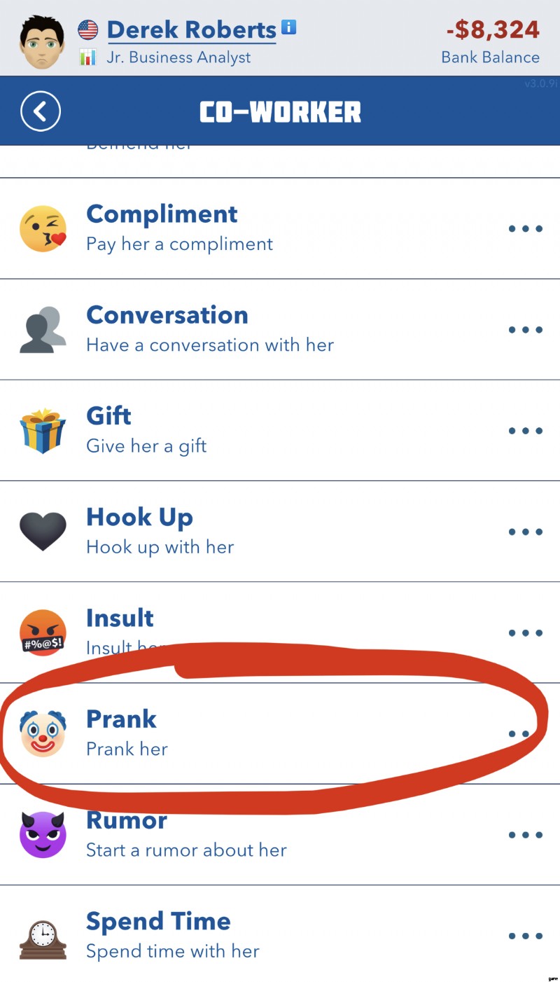 - [仕事]> [同僚]> [従業員名]> [悪ふざけ] をタップして、同僚 5 人にいたずらをします。ただし、そのうちの 1 人があなたを人事部に報告する可能性があり、職を失うリスクがあるので注意してください。