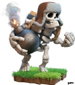 彼の外見は、背中に大きな火薬バレルと手に爆弾を持ち、茶色の(ゲーム内のチームカラーの)ウシャンカを身に着けている巨大な骸骨のようなものです.ジャイアント スケルトン カードを配置するにはエリクサー 6 個が必要です。