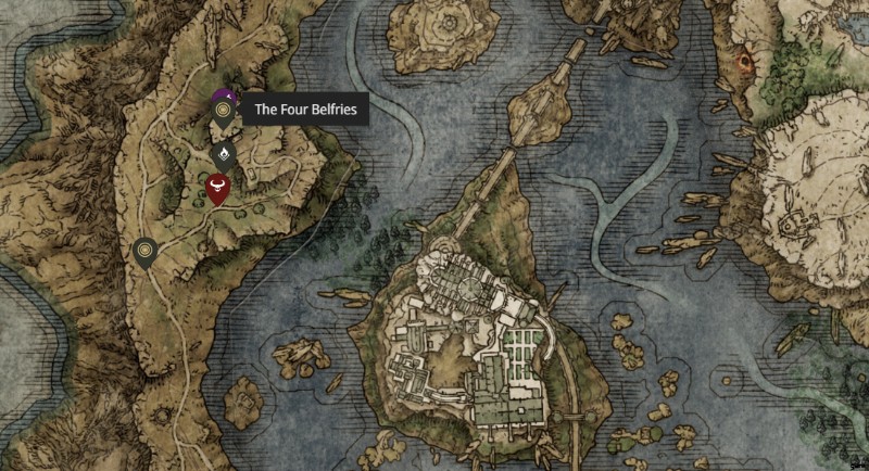 Lands Between の Liurnia of the Lakes 地域にある Raya Lucaria アカデミーの西にある Four Belfries Site of Grace を見つけることができます。 4 つの鐘楼につながるメイン パスを地図上でたどることができます。