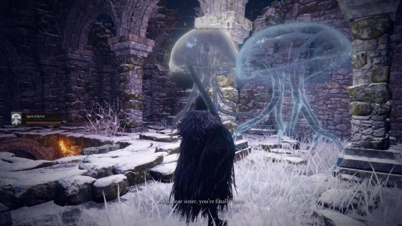 エルデン リングのスターゲイザーの遺跡に着いたら、中央にある本館に足を踏み入れます。すると、妹を探している女の子からかすかなささやきが聞こえてきます。ささやきの源はクラゲです。