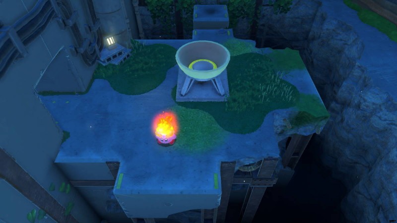 レベルの開始近くで、カービィは地下エリアにつながる巨大なパイプに入ります.下の穴に落ちないように、いくつかの狭い橋を渡る必要があります。トンネルの途中、左側に鉄ブロックの壁があり、近くに貯水タンクがあります。タンクを吸い上げてドームマウスカービィになり、上部をスピンオフすると隠されたスイッチが現れます。それを踏んで、壁の鉄ブロックを破壊してください。