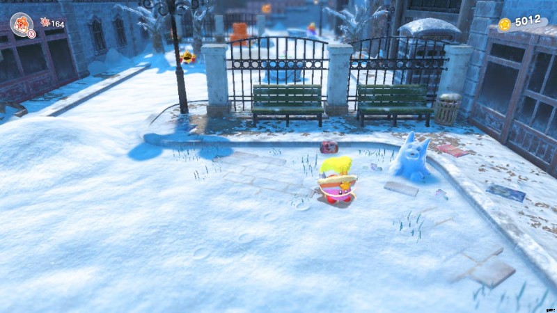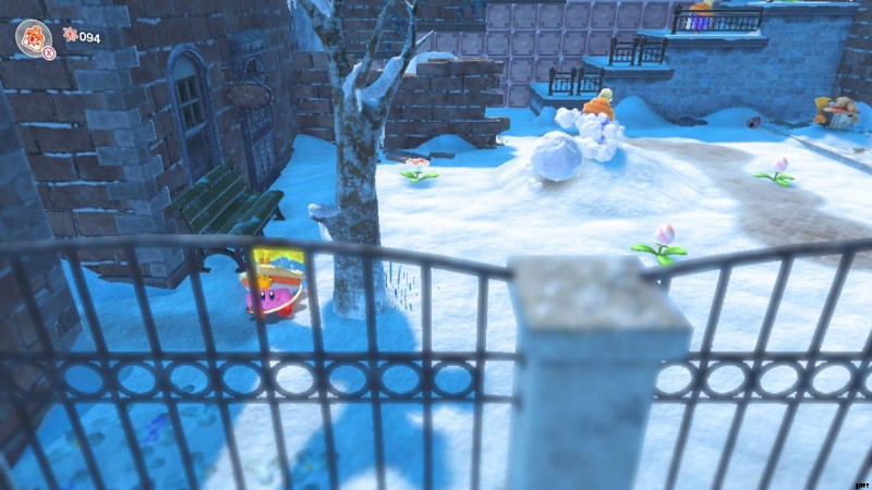 3 番目のエリアでは、階段の口のカービィを使用して建物を上る必要があります。 3 番目の階段に到達すると、最後の動物の雪像がすぐ後ろにあります。