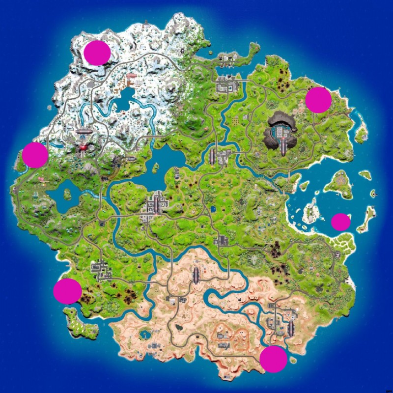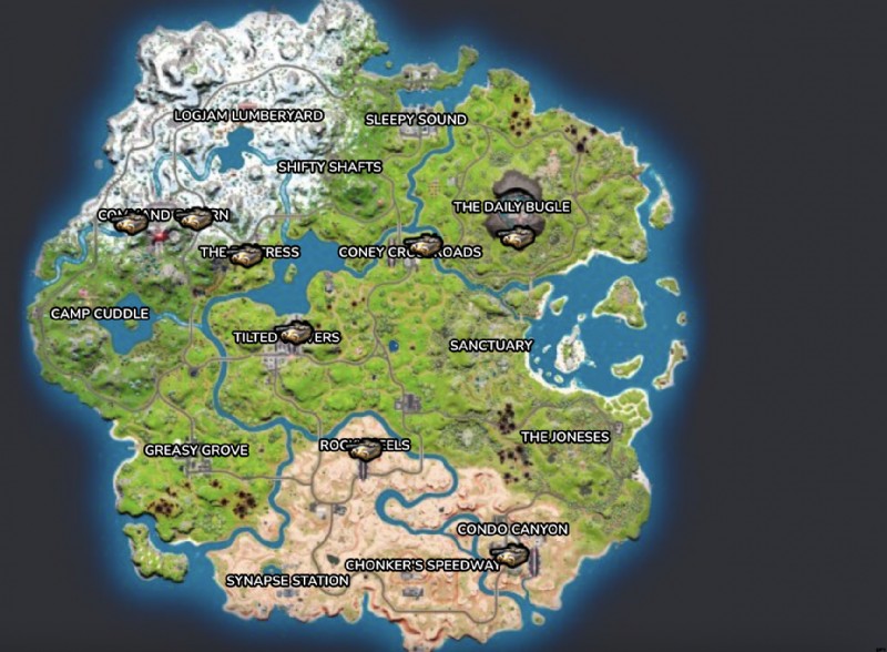 さて、必要なのはタンクだけです。セブンの前哨基地に最も近い戦車のスポーン場所はコマンド キャバーンであり、そこから水で隔てられた離島の場所のすぐ西にあるセブンの前哨基地まで戦車を簡単に移動できます。また、Fortnite.gg の厚意により、以下の画像ですべての戦車のスポーン位置をマークしました: