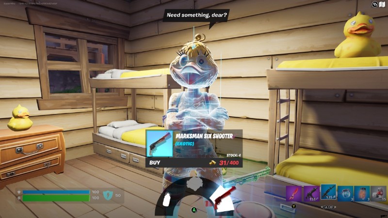 クワックリングは、キャンプ・カドルの丸太小屋の 1 つで、マークスマン シックス シューターを 400 ゴールドで販売しています。