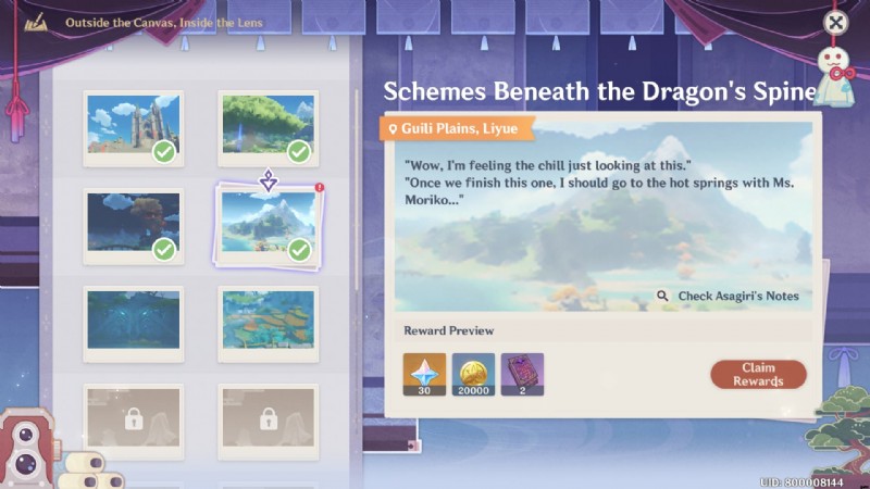 そうすることで、原神インパクトのキャンバスの外側、レンズの内側のイベントでのドラゴンの背骨の下のスキームの写真チャレンジが完了します。
