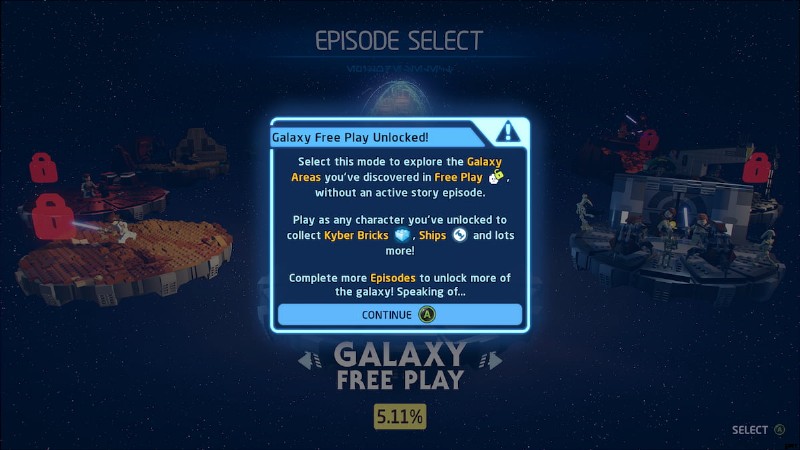 ギャラクシー フリー プレイ モードは、9 つのスター ウォーズ エピソードのうち少なくとも 1 つを完了すると利用できるようになります。ゲームを最初に開始するときは、絶賛されたスターウォーズ映画の 3 つのサガのいずれかの開始点であるエピソード I、IV、または VII にのみアクセスできます。