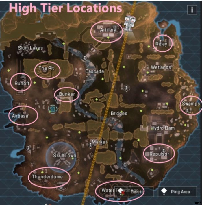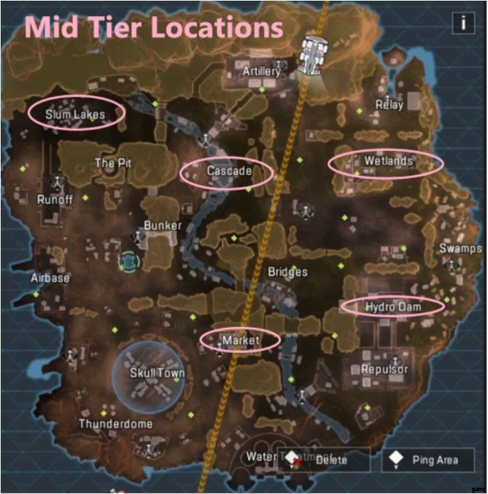 このマップの場所は、基本、中層 (青色)、高層 (紫色) のさまざまな層にも分類されます。各場所の層レベルは、プレイヤーがそこで見つけることができる戦利品の種類を示しています。基本層の場所には一般的な戦利品があり、中間層には一般的な戦利品からレアな戦利品が含まれており、レアなものが見つかる可能性はわずかです。高ティアの場所には基本的にすべてが含まれており、伝説の戦利品を見つけるチャンスが増えます!