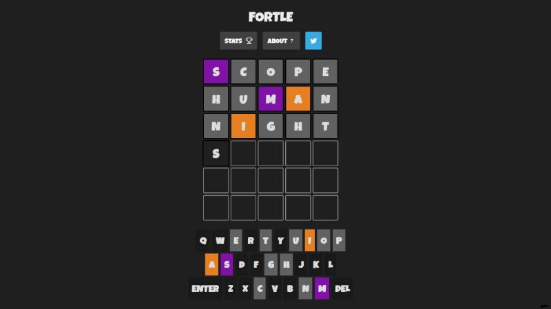 フォートルでのあなたの目標 Wordle のように、5 文字の単語を推測することです。 .ここでの違いは、単語がすべて Fortnite に関連していることです。 、だから 石 のような単語が表示されることを期待してください 、砦 、スパイ 、スコープ など。単語の推測を 6 回試行し、いくつかの文字が色分けされてヒントが得られます。