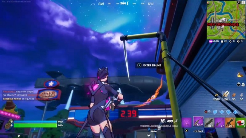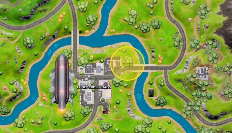 まず、Fortnite Chapter 3マップのほぼ中央にあるConey Crossroadsに着陸します.その場所に着いたら、空中に浮かぶ巨大な IO 飛行船と、飛行船と地面をつなぐジップラインを探します。