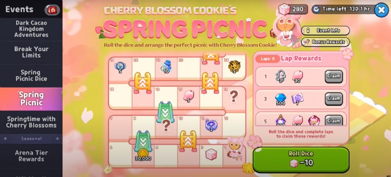 ボードの最後に到達すると、シュガー ブロッサムの花びら 30 個とクッキー カッター 3 個を受け取ります。ただし、12 周を完了すると、桜の花のクッキーのソウルストーン 2 つ、レインボー キューブ 1,000 個、王国のユニークな装飾品を受け取ることができます。イベントは 5 月 2 日まで続くので、急いでください。