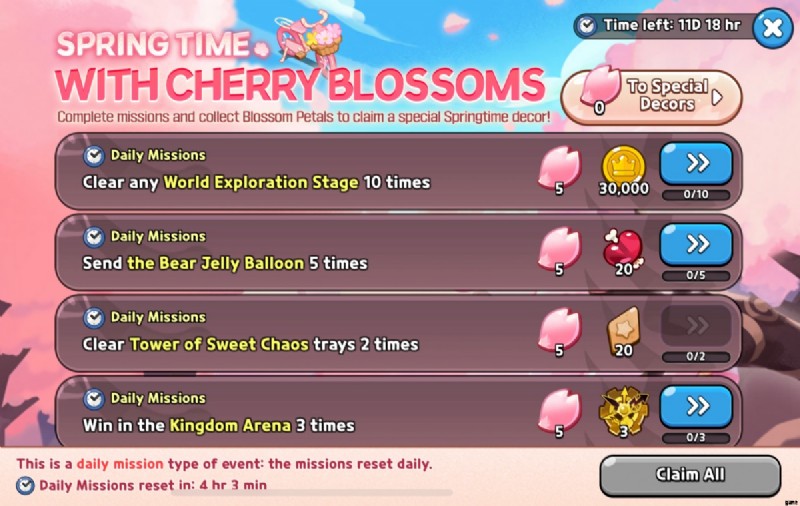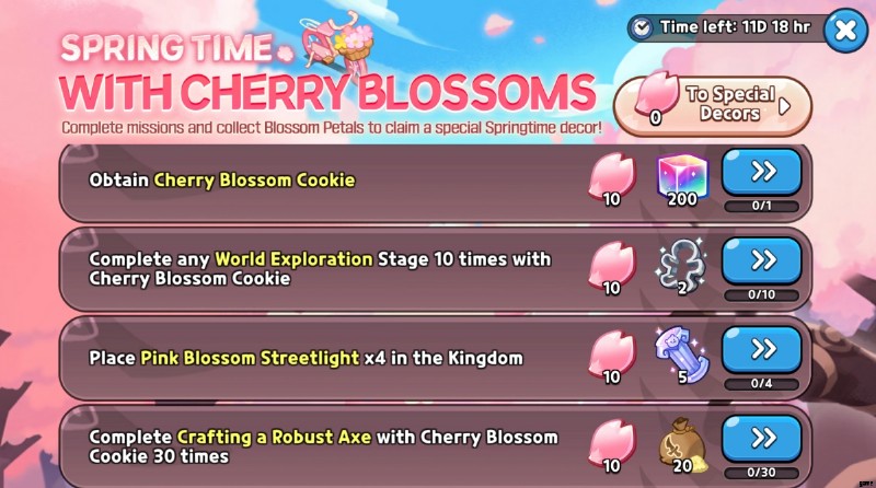- イベント ミッションを 30 個クリア – シュガー ブロッサムの花びら 15 個 + スペシャル クッキー カッター 5 個
