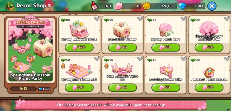 一部のミッションでは、花びらを使用して装飾品を購入する必要があります。春の花のピクニック パーティー デコレーション セットは、[ビルド] をタップし、[春] タブを見つけることで見つけることができます。また、デイリー ミッションを確認するイベント タブからアクセスすることもできます。このセットの各アイテムを 1 つ購入すると、520 シュガー ブロッサムの花びらが必要になります。 12 アイテム セットをコンプリートすると、1,000 クリスタルを獲得できます。