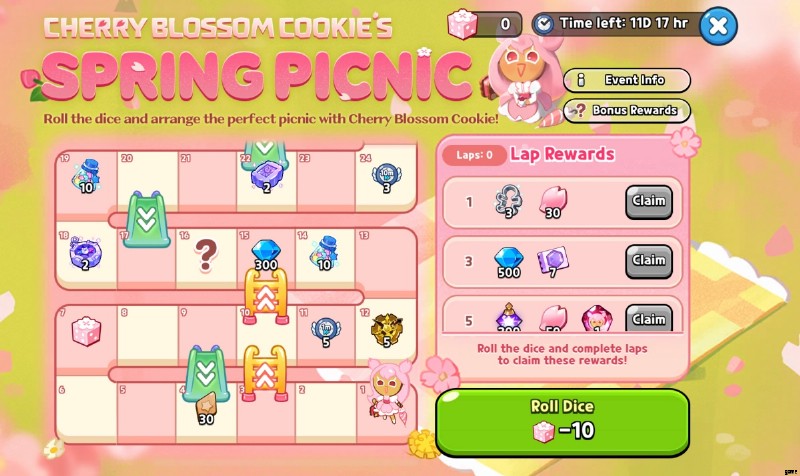この春のイベントにもう 1 つ追加されたのは、イベント メニューにある桜クッキーの春のピクニック ゲームです。春のピクニック ダイスを振るたびに、クッキー カッター、クリスタル、花びら、春の花のピクニック パーティーの装飾など、あらゆる種類のリソースを獲得するチャンスがあります。