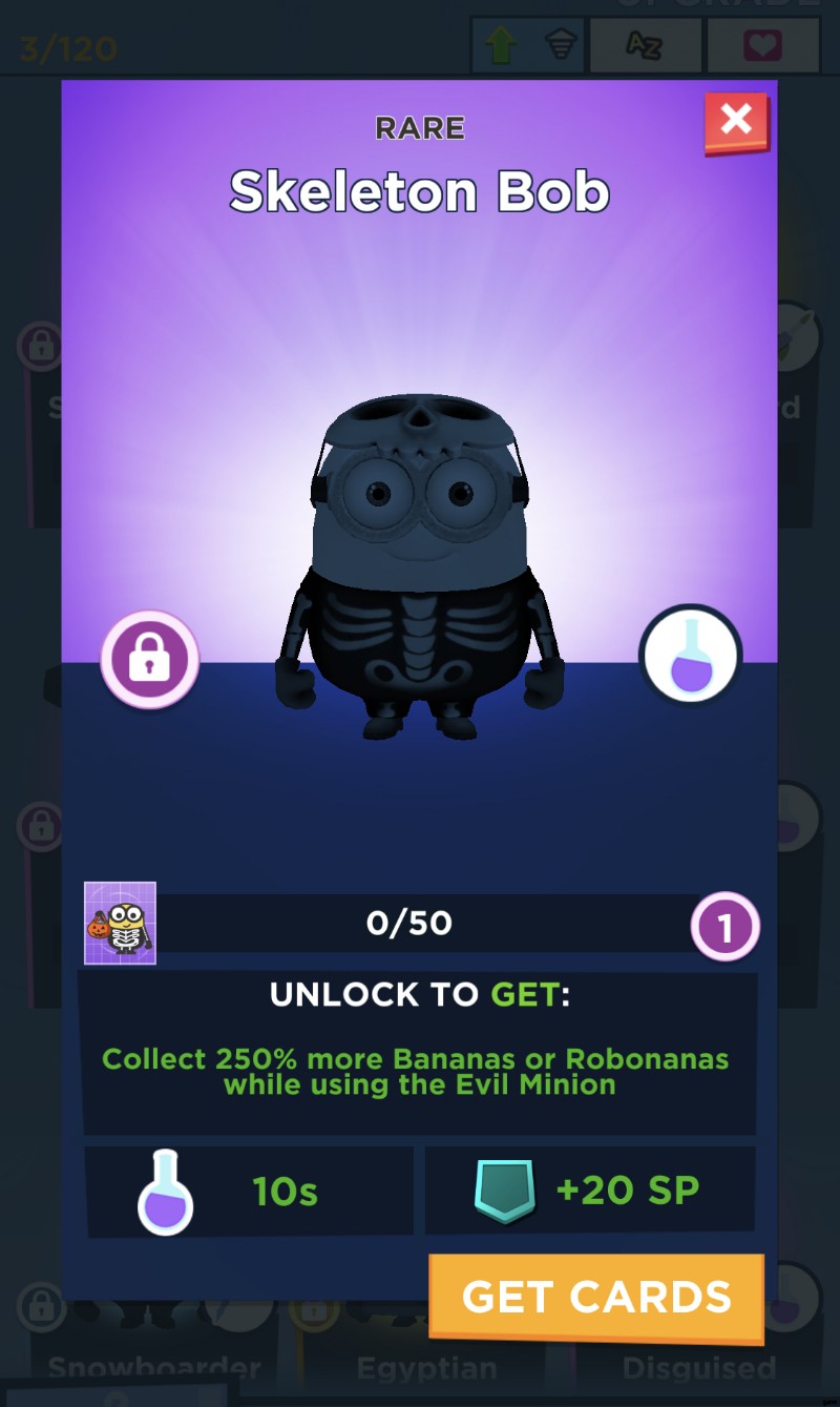 スケルトンボブ 少なくともスカウト クラスでトップ バナナ ルームを完了すると、ロックを解除できます。彼の能力には、邪悪なミニオンを使用している間、バナナまたはロボナを 250% 多く集めることが含まれます。