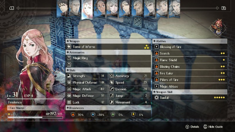 フレデリカは合計 7 つの能力 を習得します レベルアップして、ベテラン クラスのファイア キャスターとエリート クラスのファイア マスターに昇格します。 Tome of Fire 武器を強化し、Tome of Inferno をアンロックすることで、追加の非常に強力な能力をアンロックすることもできます。